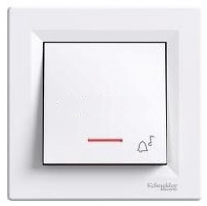 Jednopólový tlačítkový ovladač s orientační kontrolkou a symbolem "zvonek". Bezšroubové svorky, bílý.