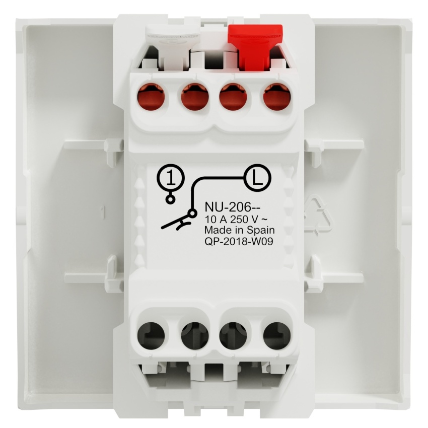 Schneider Electric Nová Unica tlačítkový ovládač NU320620 je mechanismus v barvě bílé Připojovací svorky tohoto tlačítkového spínače jsou bezšroubové. Je vyrobeno z Cu. Zn37, PBT (polybutylen tereftalát) GF30, PC (polykarbonát) GF10 FR, termoplastický materiál stabilizovaný ABS-UV, je tento tlačítkový spínač spolehlivý a odolný. Jeho šířka je 45 mm, výška 45 mm, hloubka 34,25 mm, hloubka zapuštění 21,15 mm, A výrobek váží 0,0175 kg. Kromě toho neobsahuje halogeny, což je prospěšné pro vaše zdraví. Je s orientačním světlem bez LED. Režim upevnění zařízení je nacvaknutí. Tento výrobek se prodává po 10 kusech. Navíc vyhovuje normě IEC 60669-1, směrnici LV, Ro. HS. Získal také certifikát AENOR, CE, EAC, NF. Také je šetrné k životnímu prostředí, přičemž je odolné vůči UV záření, acetonu, alkoholu, čpavku, bělidlu, tekutému mýdlu, oleji, benzínu, kapalině na čištění oken. Dielektrická pevnost, která znamená elektrickou pevnost jeho izolantu, je 2000 V. A jeho jmenovitý proud je 10 A. Tento tlačítkový spínač také neobsahuje SVHC (látky vzbuzující mimořádné obavy). Povrchová úprava je lesklá, což zajišťuje jasný, rovnoměrný a příjemný vzhled.