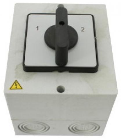 Vačkový spínač v plastové krabici s čelní deskou, upevnění na podložku 2 šrouby M5, součástí dodávky jsou 2 kabelové průchodky Pg 21.