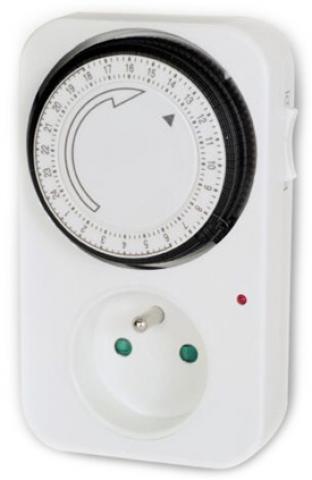 Mechanická spínací zásuvka s 24 hodinovým cyklem. Minimální nastavitelný časový úsek je 15 minut. SPÍNANÝ FÁZOVÝ VODIČ! Vlastnosti spínacích hodin ZS10: Pokud potřebujeme zapnout a vypnout spotřebič v určitém časovém rozmezí. Umožňuje funkci trvalého sepnutí zásuvky pomocí dvoupolohového přepínače. Tato funkce je indikována červenou LED diodou na čelní straně přístroje. Slouží pro časové spínání domácích spotřebičů (0–3500 W), max. induktivní zátěž 2 A, spínací prvek - spínací kontakt.