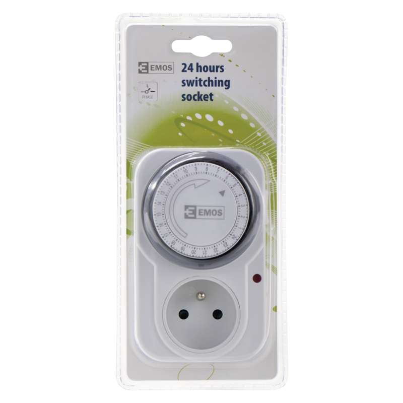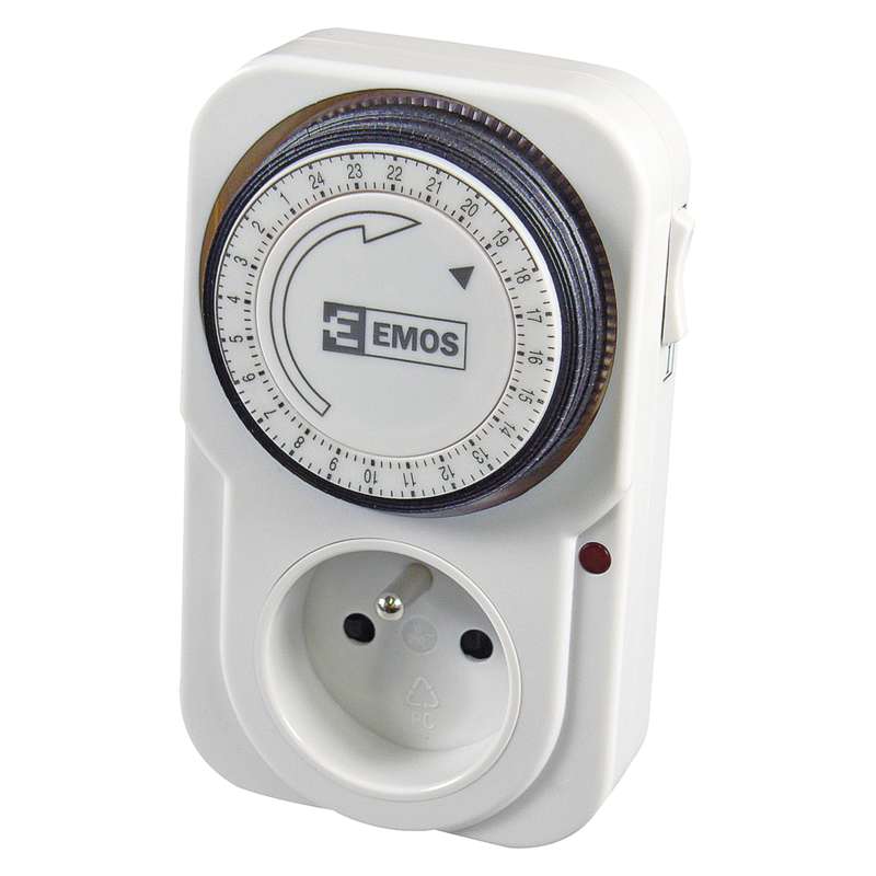 Mechanická spínací zásuvka (časovač) značky EMOS v bílé barvě. Spínací zásuvka (časovač) má 48 spínacích možností za den. Spínací zásuvku lze zapnout také manuálně.