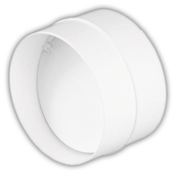 Ventilační spojka vyrobená se zpětnou klapkou o průměru 100 mm z bílé hmoty ABS.