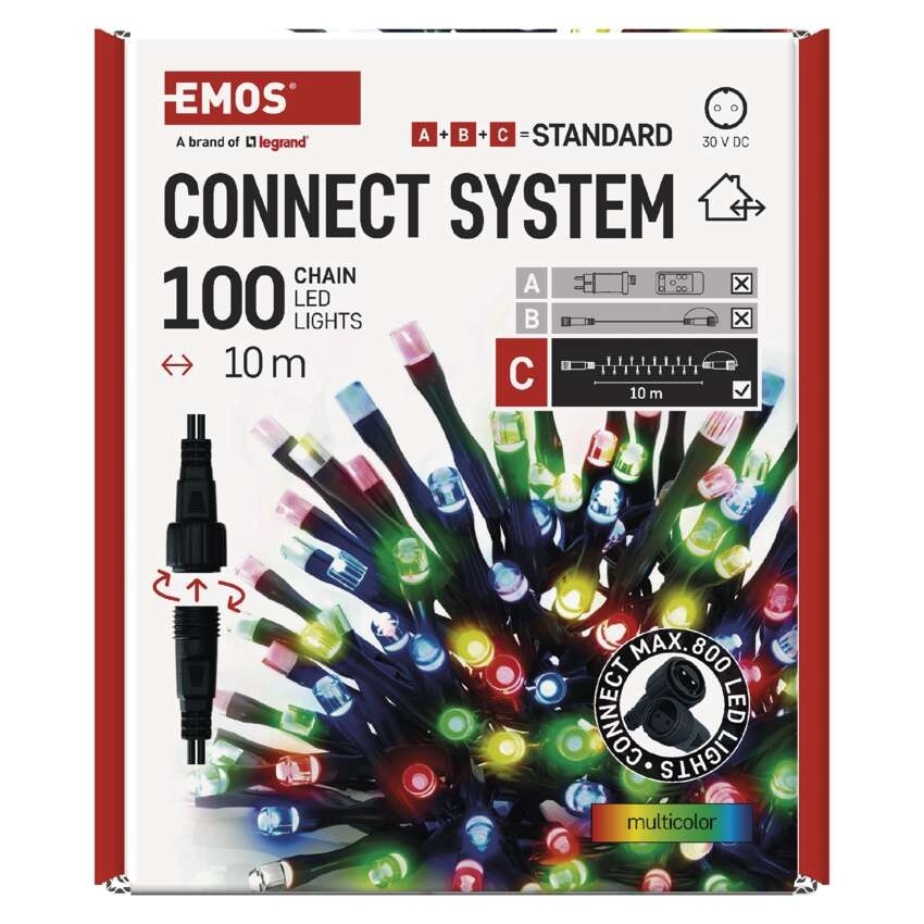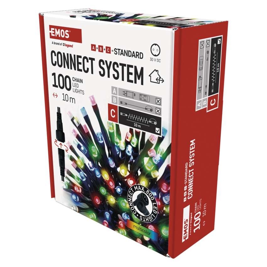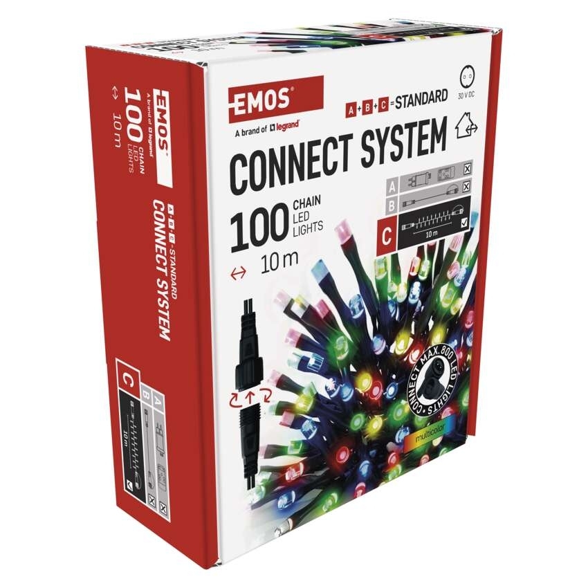 - Světelné LED řetězy CONNECT SYSTEM STANDARD jsou k dispozici v délkách 5 m nebo 10 m. Hledáte-li barvu, která bude nejlépe ladit s exteriérem či interiérem vašeho domu, můžete vybírat z teplé bílé, studené bílé, modré, zelené, červené, fialové nebo barvy multicolor, která kombinuje více barev LED světýlek na jednom řetězu.