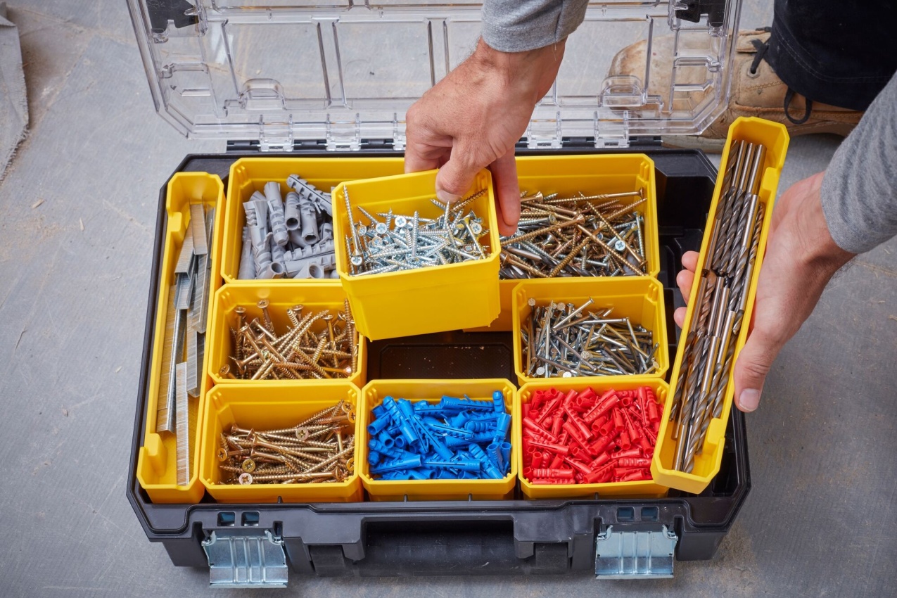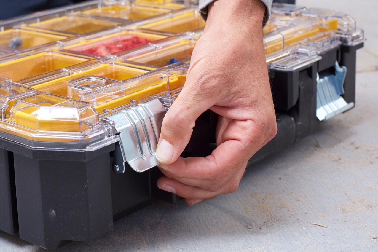- Zavřené víko uzamyká přihrádky a chrání jejich obsah před vysypáním