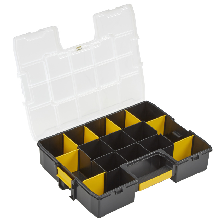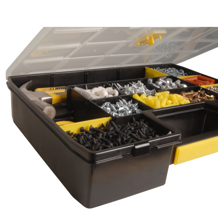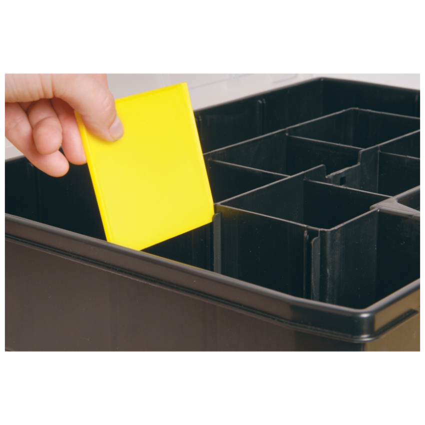 - Speciální design víka zajišťuje pevné držení přihrádek - zabraňuje tak vysypání součástek uložených v přihrádkách organizéru
