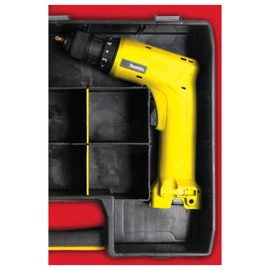 - Přihrádky „L“ tvaru umožňují uskladnění různého nářadí jako jsou kladiva apod.