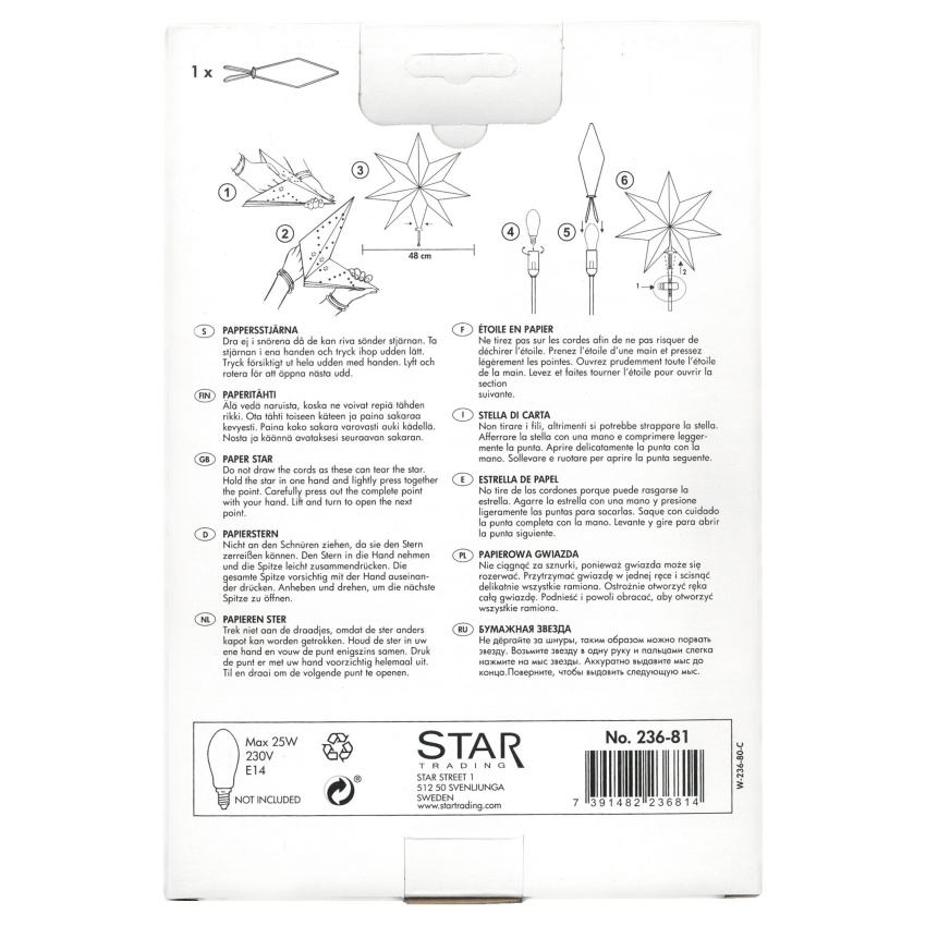 Krásná dekorativní papírová hvězda pro vnitřní použití. Krásně svítí a vytváří útulnou atmosféru v domácnosti.