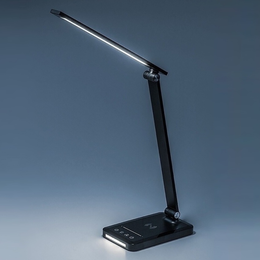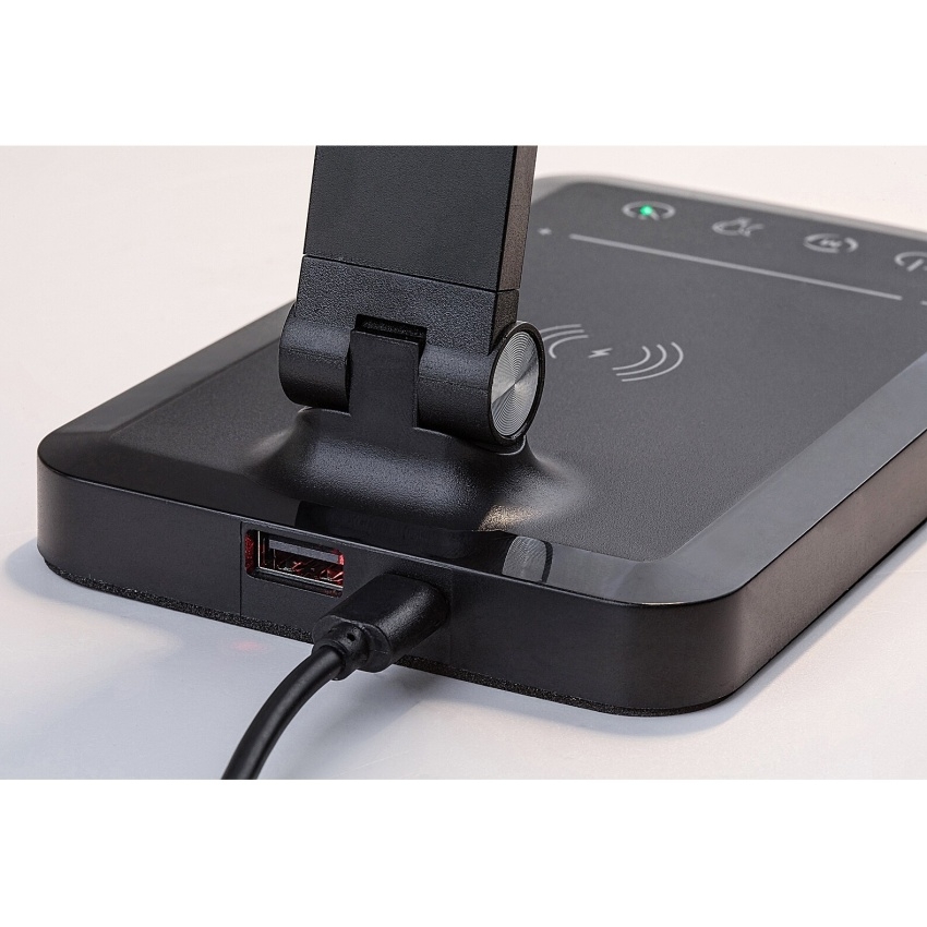 Stolní LED lampa Rabalux Traze 74213 v elegantní černé barvě je moderním a multifunkčním doplňkem pracovního stolu nebo dětského pokoje. Kombinace kovu a plastu působí stylově a současně prakticky. Lampa disponuje vestavěným LED světelným zdrojem o výkonu 5 W se světelným tokem 190 lm (560 lm bez stínítka) a nastavitelnou teplotou světla v rozsahu 3000–6500 K. Pomocí dotykového spínače lze snadno regulovat jas, barvu světla i další funkce, mezi které patří paměť, časovač automatického vypnutí a režim nočního osvětlení. Model je dále vybaven USB portem pro nabíjení mobilních zařízení a podporuje i bezdrátové nabíjení kompatibilních telefonů (QI standard). Díky úsporné LED technologii nabízí dlouhou životnost a velmi nízkou spotřebu energie.