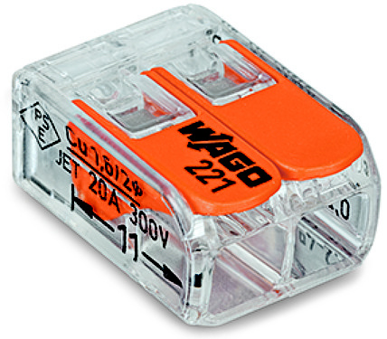Instalační dvouvodičová svorka COMPACT. Svorka je určena pro všechny druhy vodičů a šetří místo (o 40% menší než série 222). Maximální provozní teplota +85°C.