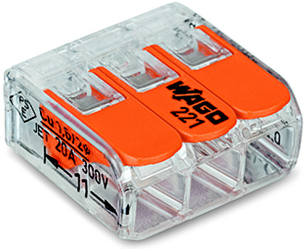 Instalační třívodičová svorka COMPACT. Svorka je určena pro všechny druhy vodičů a šetří místo (o 40% menší než série 222). Maximální provozní teplota +85°C.