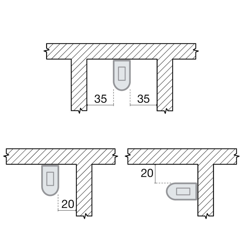 - přisazená montáž pomocí vrutů je vhodná na strop nebo na stěnu s posuvnými distančními díly pro uchycení (PA GF)