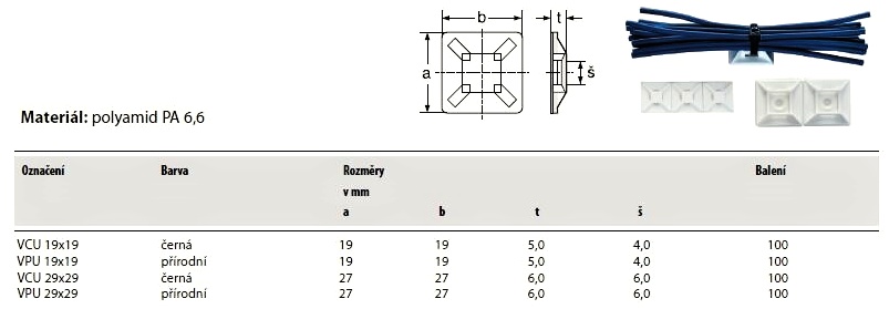 Samolepící příchytka na vázací pásky, rozměr 19,0x19,0 mm.