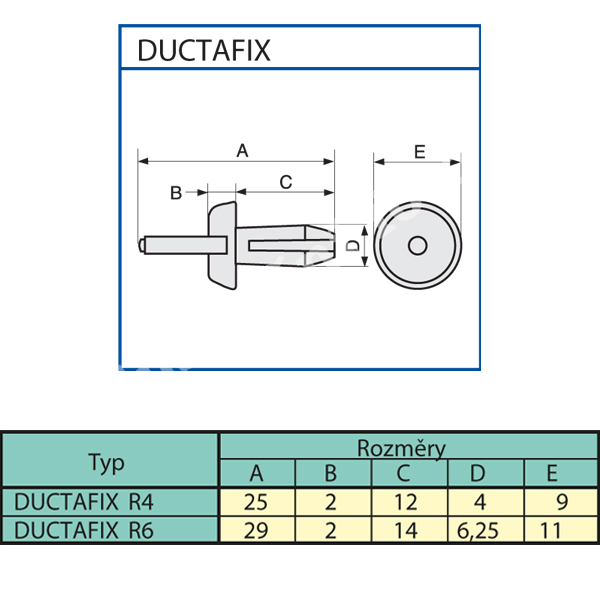 Upevňovací nýt DUCTAFIX R6. Izolační vlastnosti – vnitřek kanálu není vodivě spojen s kostrou což znemožňuje případné zkraty při průrazu izolace vodiče, snadná montáž – Extrémně krátká doba instalace, elastická hlava nýtu – tlumí vibrace, dobrá odolnost proti změnám teploty, výborné mechanické vlastnosti. Používá se v rozvaděči pro instalaci všech typů rozváděčových kanálů IBOCO na montážní desku nebo plech.