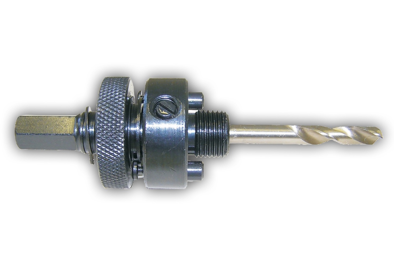Upínka k bimetalovým korunkám - pro korunky o průměru 32-152 mm, upínání je dodáváno včetně středícího vrtáku v délce 70 mm.