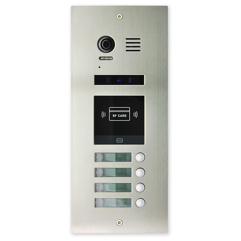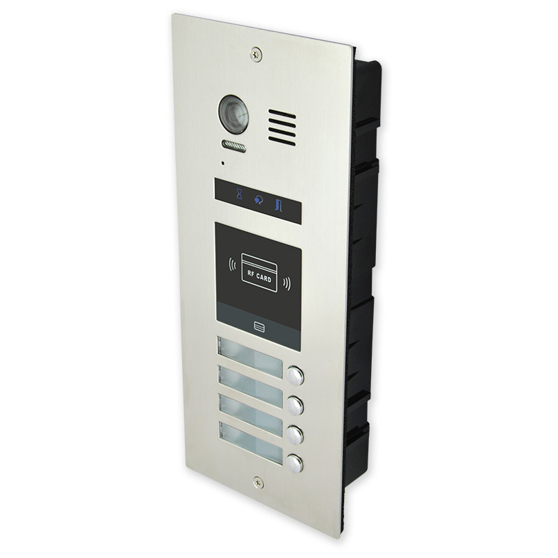 Venkovní zápustná dveřní jednotka s širokoúhlou kamerou, 4 vyzváněcími tlačítky a čtečkou karet / čipů, reproduktorem a mikrofonem. Počet vyzváněcích tlačítek lze rozšířit pomocí tlačítkového expandéru VE12-ZAP.