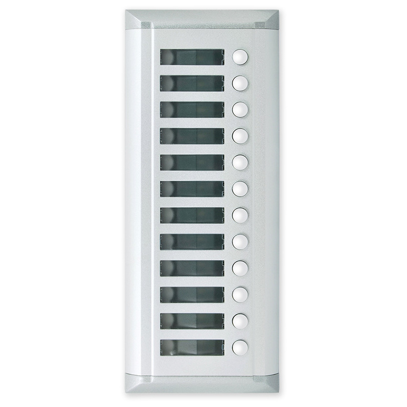 Rozšiřující venkovní jednotka s 12 tlačítky(adresami). Slouží pro rozšíření video nebo audio systému V-LINE. K video venkovní jednotce V4R lze připojit maximálně dvě rozšiřující jednotky a systém tak rozšířit na max. 28 adres. K audio venkovní jednotce AV8 lze připojit max. 4 rozšiřující jednotky do max. 56 adres.