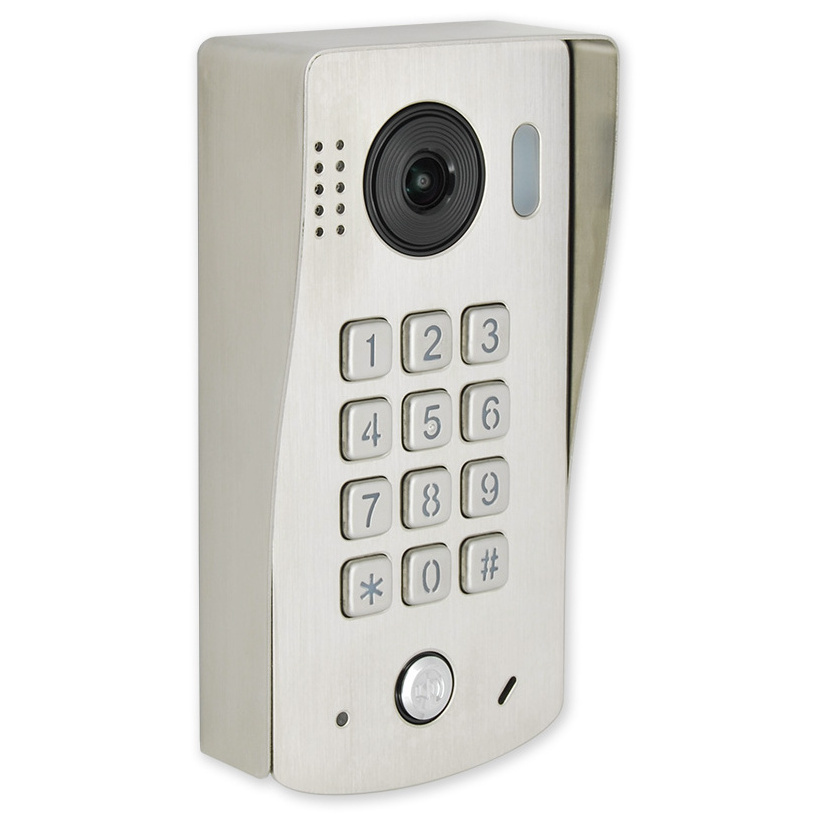 Venkovní dveřní jednotka s fisheye kamerou a mechanickou klávesnicí. Obsahuje kameru, LED přisvícení, tlačítko zvonku, mechanickou klávesnici pro ovládání relé dveřního zámku, reproduktor a mikrofon.