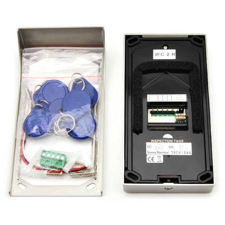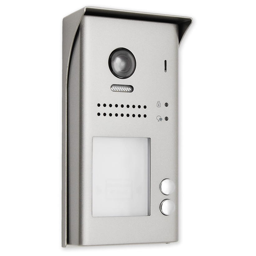 Venkovní dveřní 2 tlačítková jednotka s fisheye kamerou se 170° úhlem záběru a čtečkou karet. Obsahuje kameru, LED přisvícení, čtečku karet pro ovládání relé dveřního zámku, reproduktor a mikrofon.