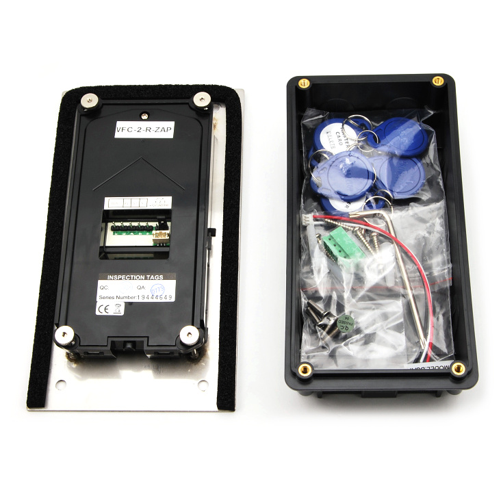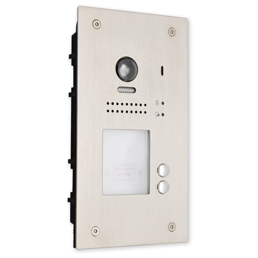 Venkovní dveřní 2 tlačítková jednotka s fisheye kamerou se 170° úhlem záběru a čtečkou karet pro zápustnou montáž. Obsahuje kameru, LED přisvícení, čtečku karet pro ovládání relé dveřního zámku, reproduktor a mikrofon.