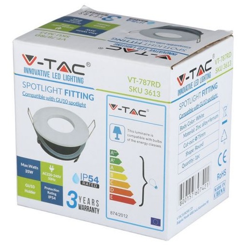 V-TAC VT-787RD-WH 3613 GU10, 0,01 W, Bílá, Hloubka: 38 mm [Třída energetické účinnosti F]