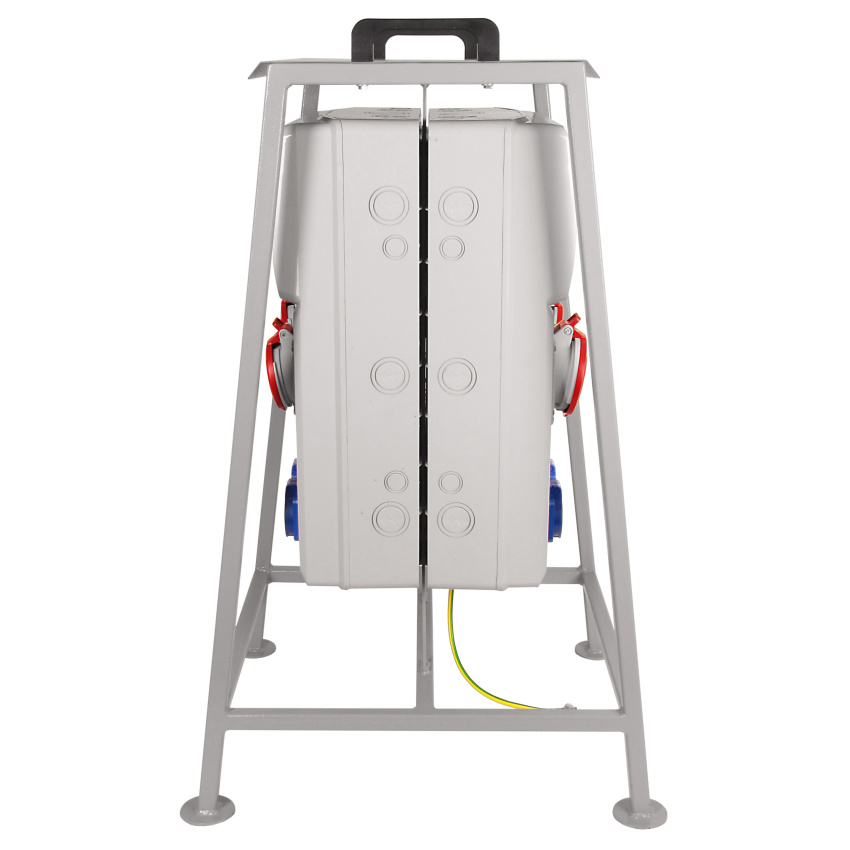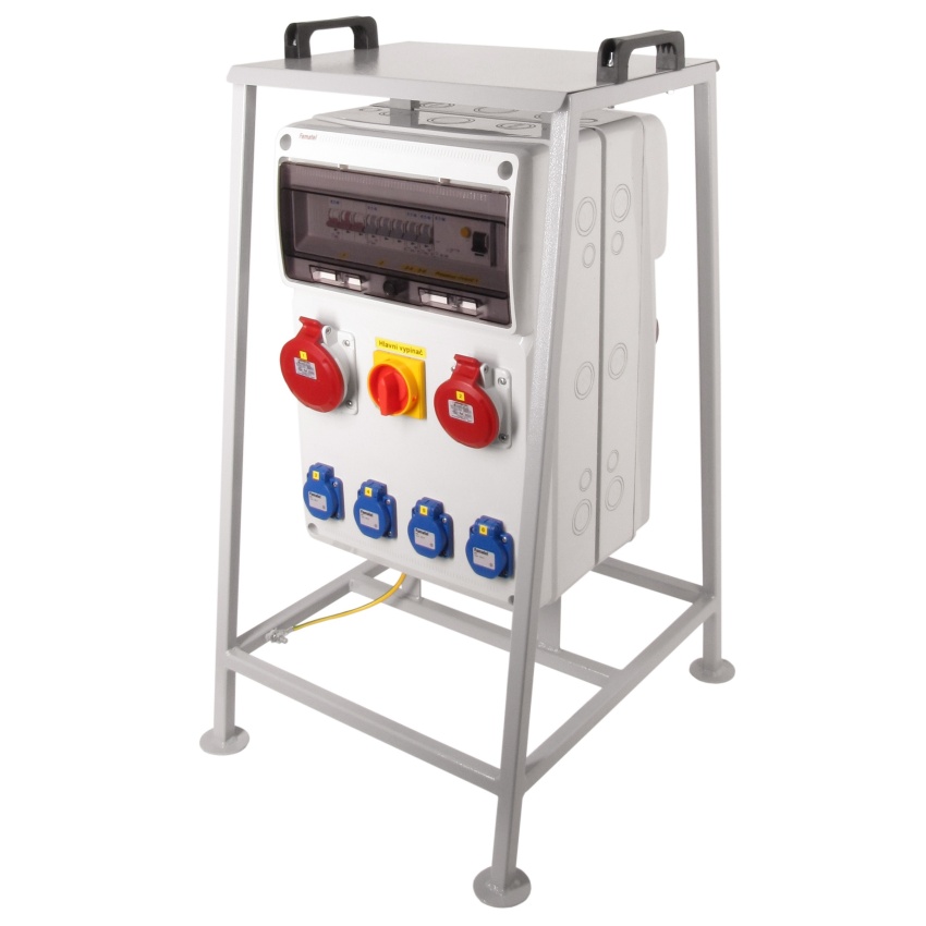 - Staveništní rozváděč (podružný rozváděč nízkého napětí) v8627 - ZSFV80202000.1 Zás. skříň IP54 jištěná s 2 chrániči 63/4/003 na kov. stojanu a s hl. vypínačem 63A na kov. stojanu, zásuvky 8x230V/16A (s ochranným kolíkem dle ČSN), 2x400V/16A/5pól, 2x400V/32A/5pól, jistící přístroje EATON 10kA: 8xPL7-B16/1, 2xPL7-B16/3, 2xPL7-B32/3, podružný elektroměr, 2xPF7-63/4/003 na vstupu (citlivost na reziduální proud 30mA, typ AC), připojovací svorkovnice do max. 5x25 mm2, použitá pouzdra: 2x 3952 - celkem k dispozici 32mod. míst, rozměry pouzdra 3952: 500x330x155mm, plastový materiál (ABS), IK08, zkouška žhavou smyčkou 650°C, bezhalogenová a UV odolná, způsob instalace: mobilní - kovový samonosný stojan, barva: světle šedá, rozsah teplot -25°C +85°C, aplikované normy: IEC 61439-4