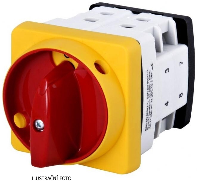 Vačkový spínač VSN 10 se schématem 1103 a spínacím úhlem 45°, polohy 0-1 (obrázek A8). Vestavné provedení - šroubové uchycení. Příslušenství: uzamykání visacím zámkem NVZ1R (střední 66x66 mm, červený ovladač). Délka odizolování vodiče: 10 mm.