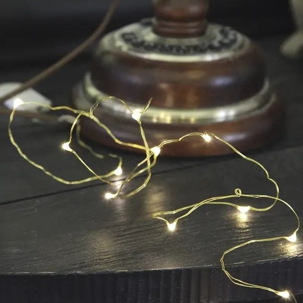 Světelný řetěz na baterie s 12 LED kapkami rosy. Světelný řetěz má mosazný drát a světlo vydává teplý bílý svit. Lze použít v různých dekoracích, jako jsou květinové aranžmá, do oken a na zeď.