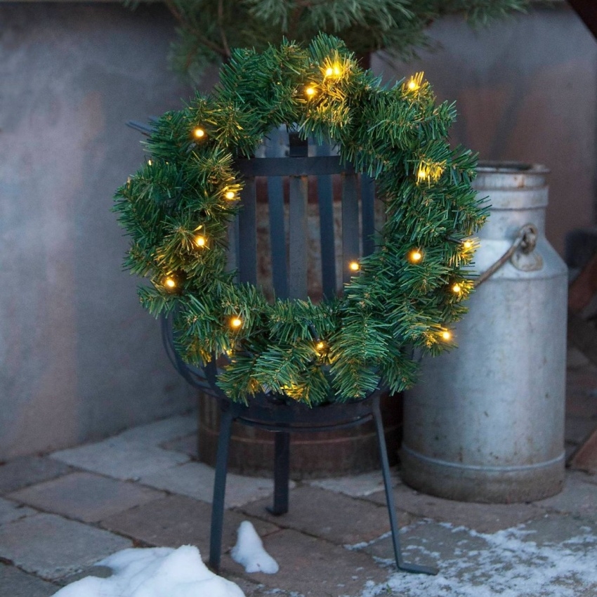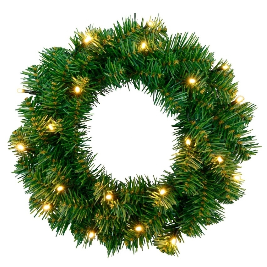 LED venkovní vánoční věnec se senzorem soumraku. Počet LED diod: 20. Barva světla: teplá bílá. Délka napájecího kabelu: 50 cm. Na baterie 3x AA (nejsou součástí balení). Integrovaný LED řetěz s teplým bílým světlem a pohybovým senzorem. Vhodný pro venkovní použití (IP44). Baterie AA nejsou součástí balení.