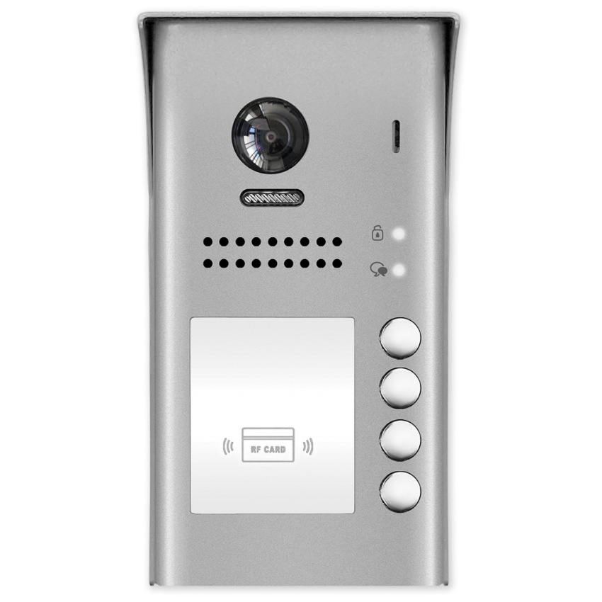 Venkovní dveřní 4 tlačítková jednotka s fisheye kamerou se 170° úhlem záběru a čtečkou karet. Obsahuje kameru, LED přisvícení, čtečku karet pro ovládání relé dveřního zámku, reproduktor a mikrofon.