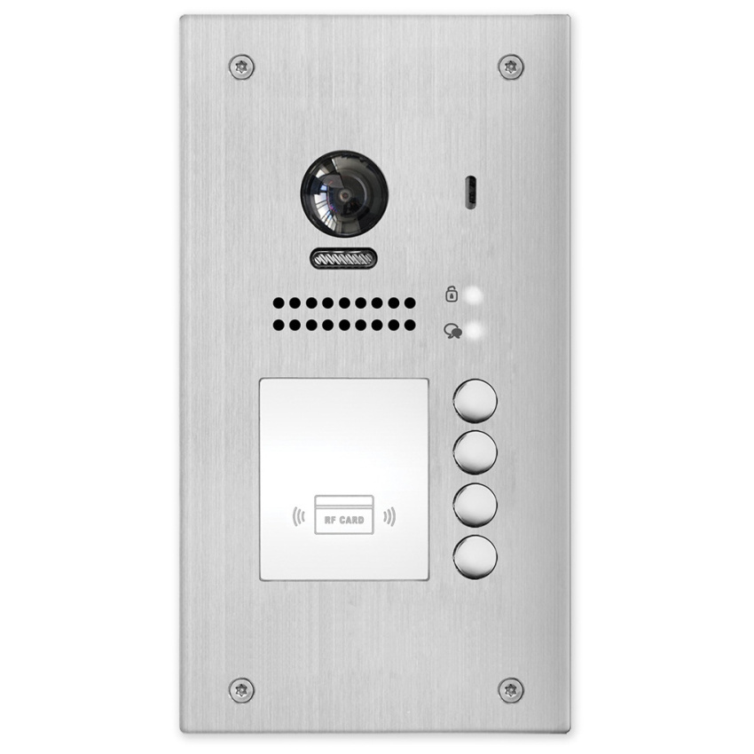 Venkovní dveřní 4 tlačítková jednotka s fisheye kamerou se 170° úhlem záběru a čtečkou karet pro zápustnou montáž. Obsahuje kameru, LED přisvícení, čtečku karet pro ovládání relé dveřního zámku, reproduktor a mikrofon.