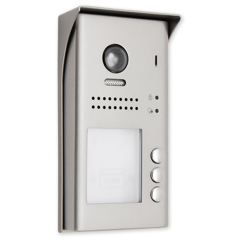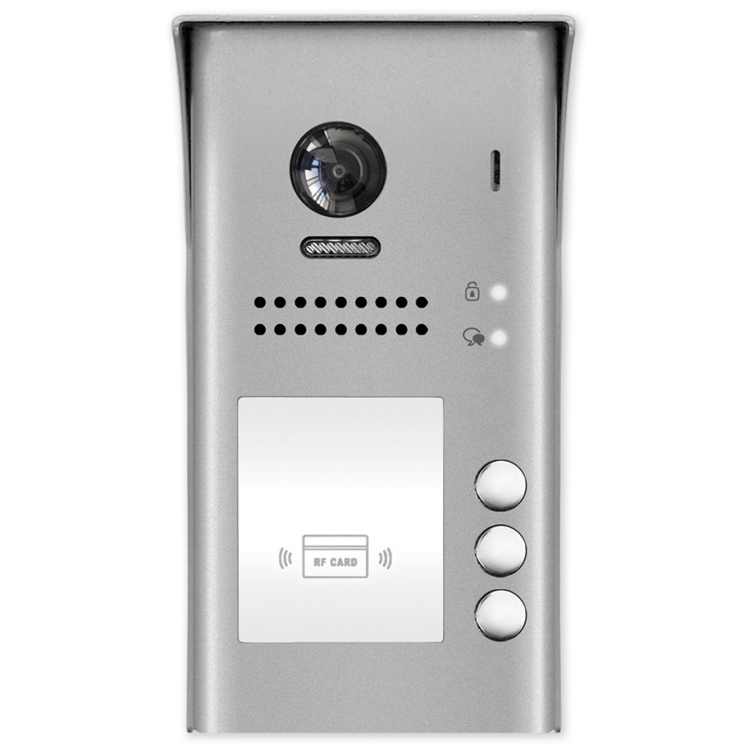 Venkovní dveřní 3 tlačítková jednotka s fisheye kamerou se 170° úhlem záběru a čtečkou karet. Obsahuje kameru, LED přisvícení, čtečku karet pro ovládání relé dveřního zámku, reproduktor a mikrofon.