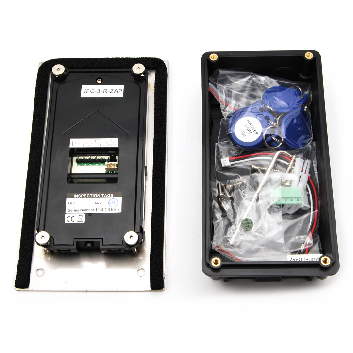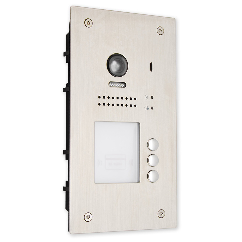 Venkovní dveřní 3 tlačítková jednotka s fisheye kamerou se 170° úhlem záběru a čtečkou karet pro zápustnou montáž. Obsahuje kameru, LED přisvícení, čtečku karet pro ovládání relé dveřního zámku, reproduktor a mikrofon.
