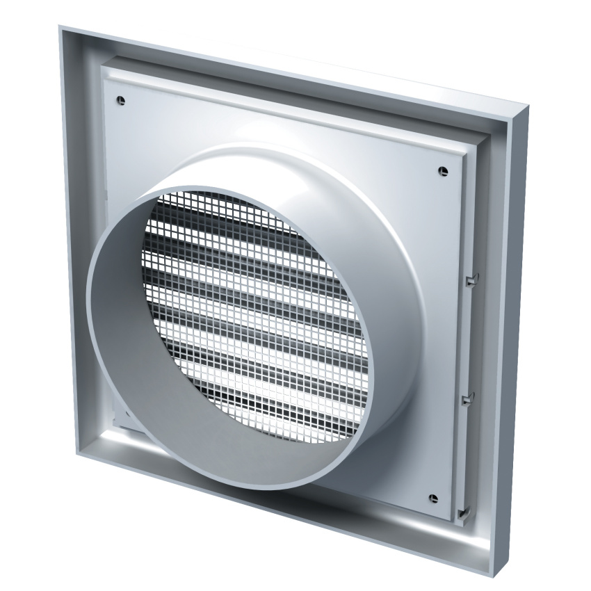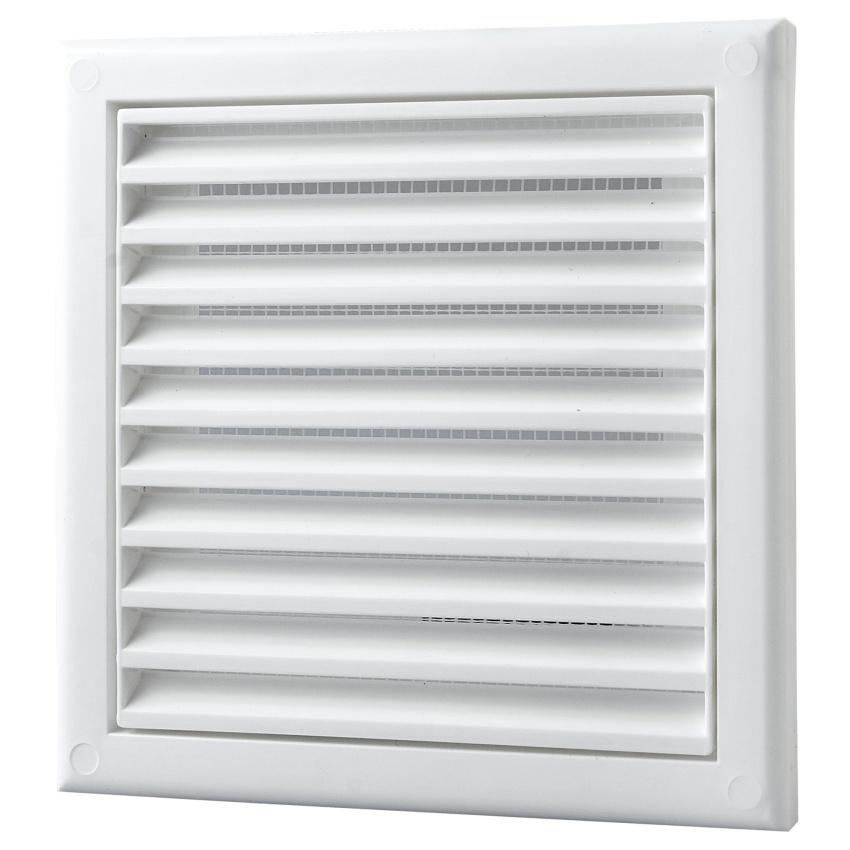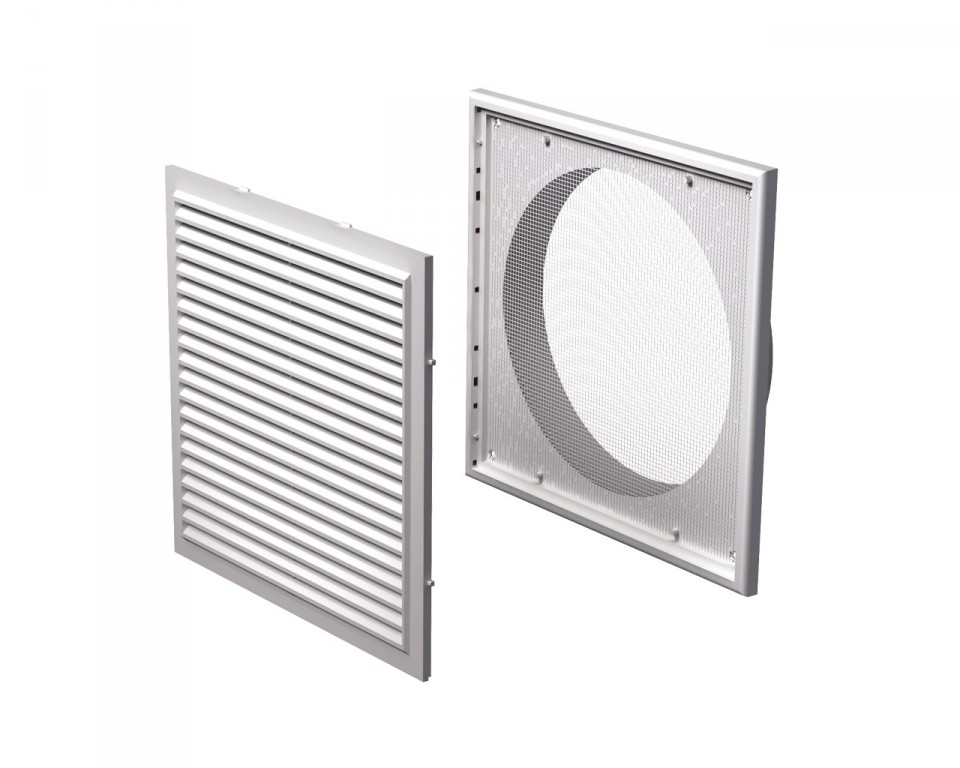 Plastová mřížka s kruhovým nástavcem s pevnou žaluzií a síťkou proti hmyzu z plastu ABS v bílé barvě.