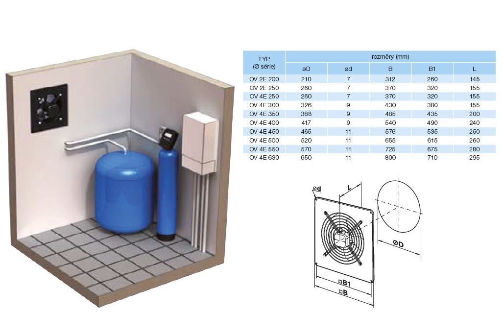 Průmyslový axiální ventilátor série OV. Tento ventilátor je určen k odsávání vzduchu z průmyslových objektů jako jsou garáže, autoservisy, dílny, sklady a podobně, kde je požadován vysoký průtok vzduchu. Vzhledem ke svým technickým parametrům se doporučuje ventilátory používat v kombinaci s krátkými vzduchotechnickými potrubími s nízkou tlakovou ztrátou, popřípadě k odsávání přímo přes stěnu.