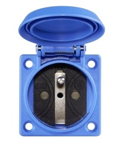 Durable termoplastic Type E CEE 7/5 zásuvkové zásuvky pro použití s francouzskými zásuvkami typu E CEE 7/6 se 2 vývody a zemnicí zástrčkami, se zemnicím kontaktem podle francouzských a belgických norem. Nástrčka pro montáž na přírubu se vyrábí dle belgického standardu NBN C61-112 a dle francouzského standardu NF C61-314 a je dimenzována na vysavač 16A/250 Vac. Tato zásuvka je zakrytá pro bezpečnost a je vybavena lid s pružinou. Tato francouzská zásuvka typu E je chráněna proti postříkání krytím IP54 (lid