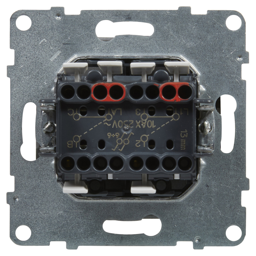 - Vypínač se dvěma tlačítky. Dvě samostatné schodišťové spojky umístěné v jednom modulu.