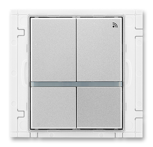 Vysílač RF čtyřtlačítkový, nástěnný. Při stisknutí jednotlivých částí hmatníku se vyšle odlišný kód (lze tak nezávisle ovládat dva nebo až čtyři přijímače). Vysílání a případný pokles napájecího napětí jsou indikovány LED diodou. Pro nástěnnou montáž (pomocí dodávaných oboustranně lepicích terčíků nebo vrutů). Neumísťovat na kovovou podložku!