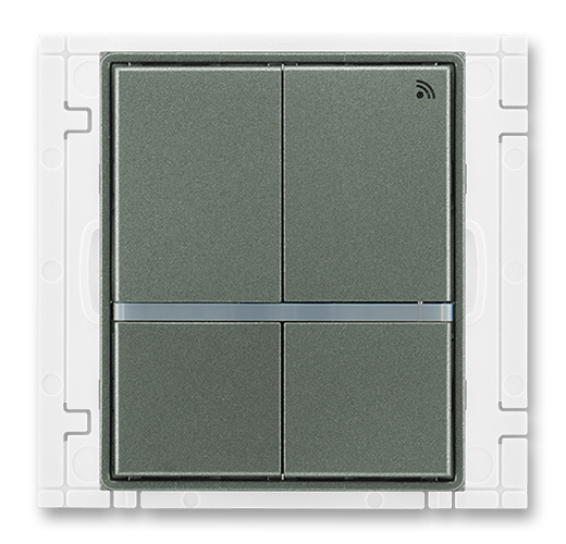 Vysílač RF čtyřtlačítkový, nástěnný. Při stisknutí jednotlivých částí hmatníku se vyšle odlišný kód (lze tak nezávisle ovládat dva nebo až čtyři přijímače). Vysílání a případný pokles napájecího napětí jsou indikovány LED diodou. Pro nástěnnou montáž (pomocí dodávaných oboustranně lepicích terčíků nebo vrutů). Neumísťovat na kovovou podložku!