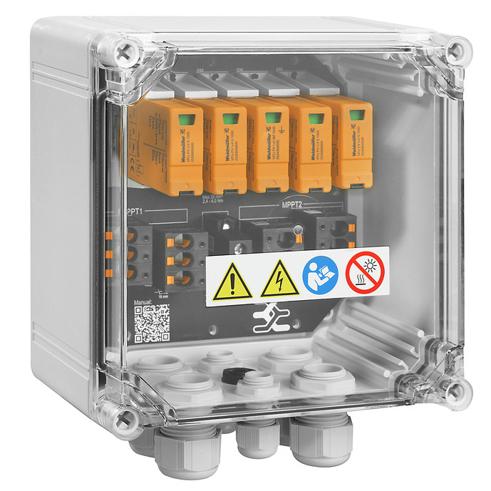 Weidmüller DC skříň PVN DC 2I 1O 2MPP SPD1R CG 11 je vhodná pro použití k fotovoltaickým systémům. Rozvodnice je osazená přepěťovými ochranami typu I a II do 1100 VDC. Má 2 vstupy a 1 výstup, tedy je vhodná na 2 stringy, které je možné zapojit do 2 MPPT střídače. Rozvodnice splňuje krytí IP65 tedy ji je možné použít i do venkovního prostředí.