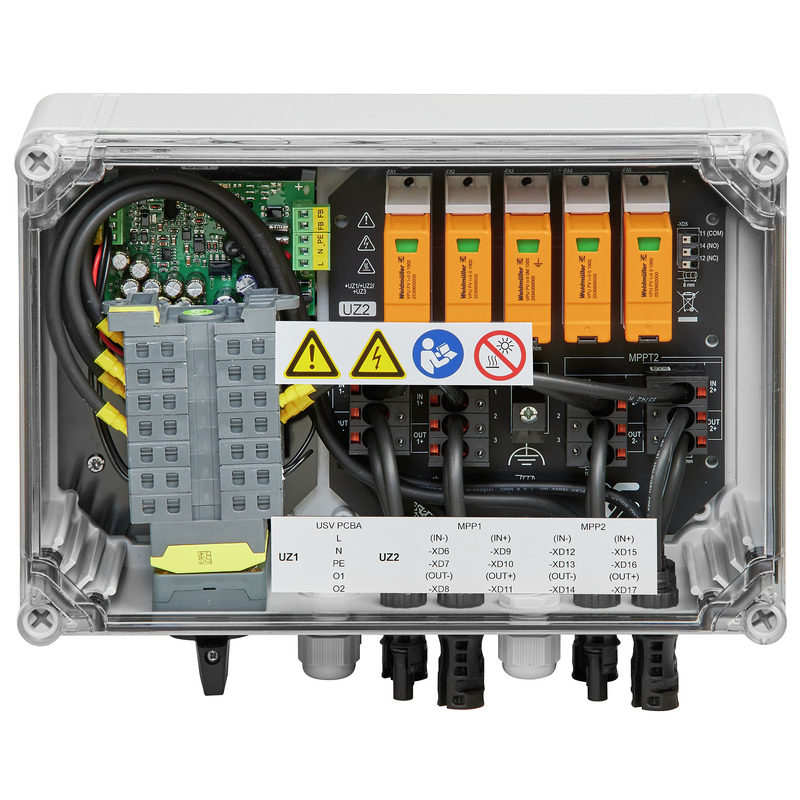 Fotovoltaika, Kombinovaná skříň, Požární tlačítko, 1100 V, 2 MPP, 2 vstupy / 1 výstup na MPP, Přepěťová ochrana I / II, Vzdálený odpojovač, WM4C
