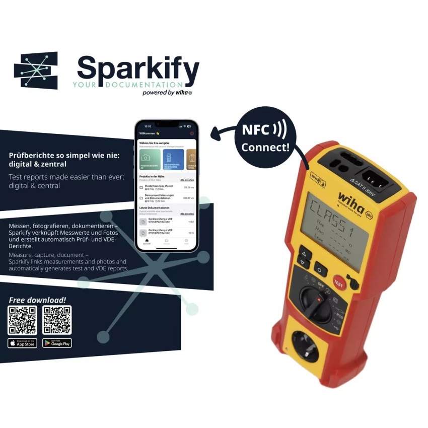 Tester přístrojů Wiha mění pomocí aplikace Sparkify revolučně zkoušku přístrojů. Založení nového zkoušeného přístroje je jednoduché a rychlé pomocí aplikace tak, že integrovaná technologie AI pro rozpoznávání obrazu přístroj automaticky zaregistruje. Pomocí snímku typového štítku jsou zaznamenány všechny informace o přístroji. Samotné měření je bezpečně a intuitivně řízeno otočným kolečkem na přístroji. Pomocí NFC jsou výsledky měření přenášeny bezkontaktně do aplikace Sparkify a přímo propojeny se zkoušeným přístrojem. Tester přístrojů Wiha zaujme svou kompaktní konstrukcí, která umožňuje použití také ve stísněných prostorách. Díky možnosti provozu v síti nebo na baterie nedochází ke ztrátě výsledků měření. Tester přístrojů značky Wiha pokrývá široké spektrum: přístroje třídy ochrany I–II, prodlužovací kabely, proudové chrániče nebo třífázová vedení. Promyšlená taška vč. přihrádek a systému Molle umožňuje mobilní použití, snadnou přepravu a také uspořádané uložení i dalšího příslušenství.