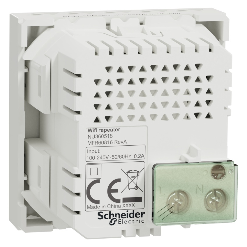 Schneider Electric Unica bezdrátový opakovač (repeater) NU360518 je v barvě bílé. Je 45 mm široký, 45 mm vysoký a 39 mm hluboký. Hmotnost výrobku je 0,53 kg. Protokol jeho komunikačního portu je IEEE 802.11 b/g/n a jeho přenosová rychlost je 300 Mb/s (MCS15, 40 MHz). Zabezpečení sítě šifrováním je Wi-Fi Protected Access II (WPA2-PSK), což je bezpečný šifrovací protokol. Snadno se nastavuje pomocí WPS (Wi-Fi Protected Setup) prostřednictvím tlačítka nebo průvodce nastavením nebo QR kódu. Dostupnost sítě lze řídit pomocí praktického vypínače na každém opakovači nebo naprogramováním plánovače. Režim upevnění tohoto opakovače wifi je nacvaknutí. Instalace je stejně snadná jako instalace tradiční zásuvky. Tento bezdrátový opakovač neobsahuje SVHC (látky vzbuzující mimořádné obavy). Navíc splňuje normu IEEE 802.11 b/g/n. Kromě toho má toto zařízení krytí IP20. Neobsahuje rtuť, stejně jako těžké kovy, a pečuje tak o životní prostředí a vaše zdraví. Opakovač Wi-Fi (repeater) lze nainstalovat na libovolné místo, kde je třeba posílit signál, bez nutnosti natahování nových datových kabelů. Rozšiřuje konektivitu v domácnostech, malých kancelářích nebo kavárenských sítích do všech vnitřních i venkovních prostor. Moduly jsou navrženy tak, aby se hodily k našim nejoblíbenějším řadám vypínačů a zásuvek včetně Nová Unica a MurevaStyl. Řady zahrnují širokou škálu profilů, barev, textur a krycích rámečků, které se hodí k jakémukoli interiéru. V dnešní době chce být každý neustále a všude připojen k internetu. S naší novou řadou opakovačů Wi-Fi (WIFI repeaterů) nyní můžete snadno rozšířit signál do každé místnosti, a dokonce i venku.