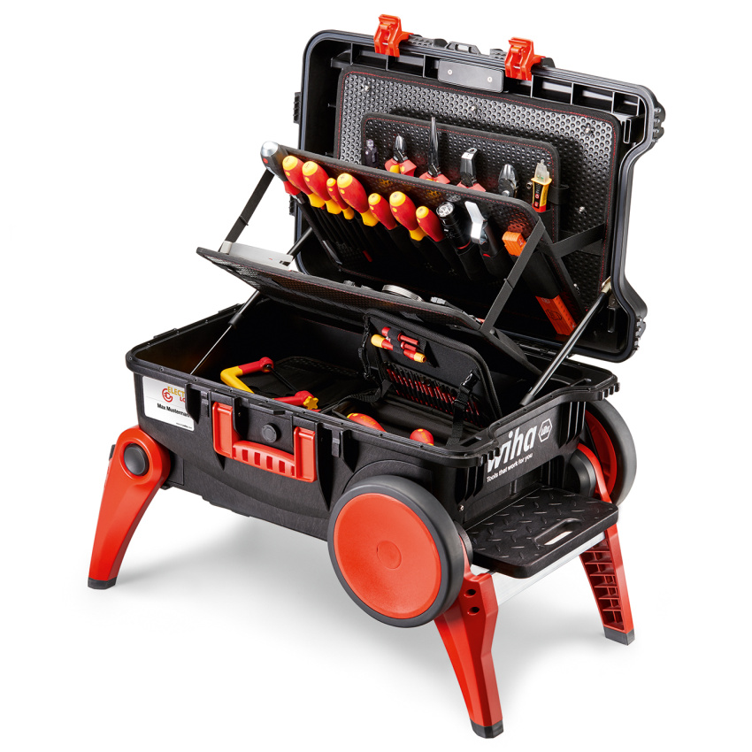 Elektromechanici potřebují nejrůznější nářadí na nejrozmanitějších místech. Jen málo kufrů na nářadí nabízí dostatečnou stabilitu a udržet pořádek ve veškerém potřebném nářadí často bývá nadlidský úkol. Kufr na nářadí Wiha XXL III electric je dokonalý opak – obsahuje rozsáhlý sortiment nástrojů, dostatek úložného prostoru a naprostou robustnost. Díky mimořádně velkým kolům je tažení kufru po neschůdném terénu nebo schodech naprostá hračka. Výklopné nohy zajistí, že vám kufr zároveň poslouží jako protiskluzový stupínek. Vyvýšená poloha navíc snižuje namáhání zad a zvyšuje pohodlí při vyjímání nářadí. Vroubení ve tvaru V se stupnicí ve víku kufru usnadňuje řezání například kabelových kanálů na stavbě. Díky rozsáhlé výbavě kufru XXL III electric máte vždy po ruce vhodné nářadí pro každý způsob použití. Ergonomické šroubováky, inovativní kleště, mobilní šroubovák a sada nástavců slimVario® pro rychlé servisní zásahy a mnoho dalších nástrojů vám znatelně usnadní každodenní práci. Plně izolované nářadí zároveň uživatele chrání při práci na dílech pod napětím. Ergonomická koncepce ručního nářadí Wiha také výrazně šetří svaly a šlachy, a to zejména při dlouhotrvající práci. Kufr vyrobený z odolného polypropylenu je vybaven plynovými tlumiči, které drží víko v různých polohách a zamezují zhmoždění prstů v důsledku jeho nechtěného zavření.