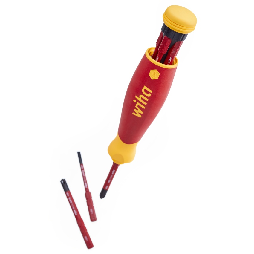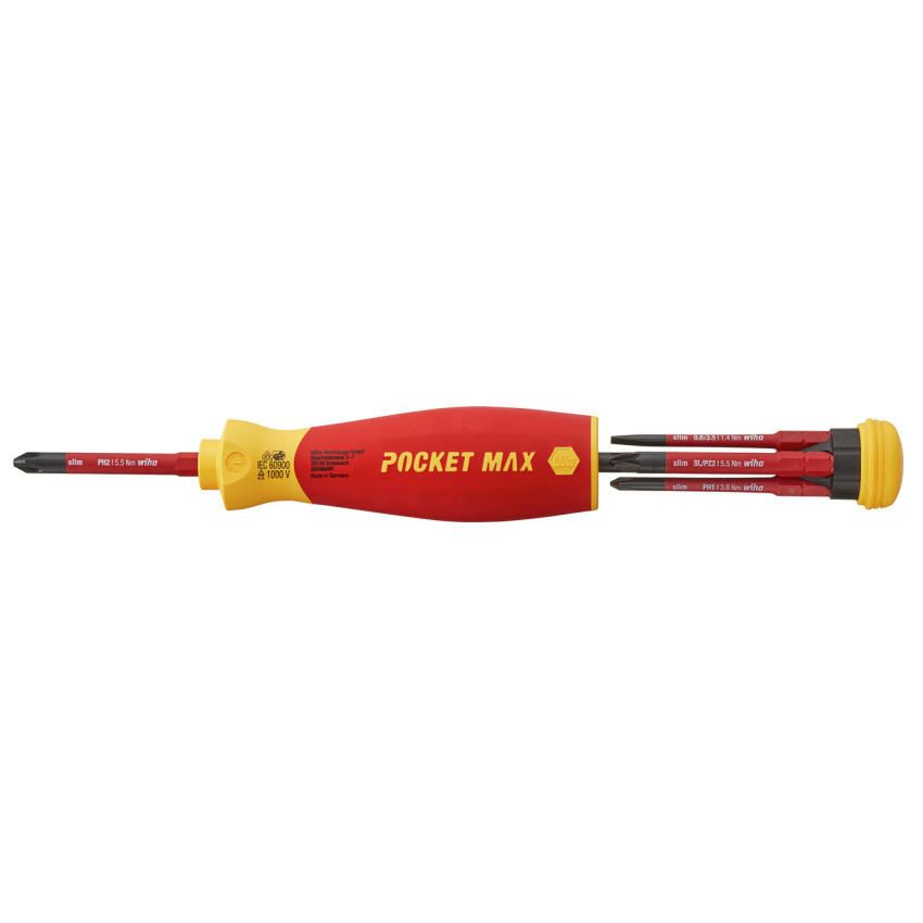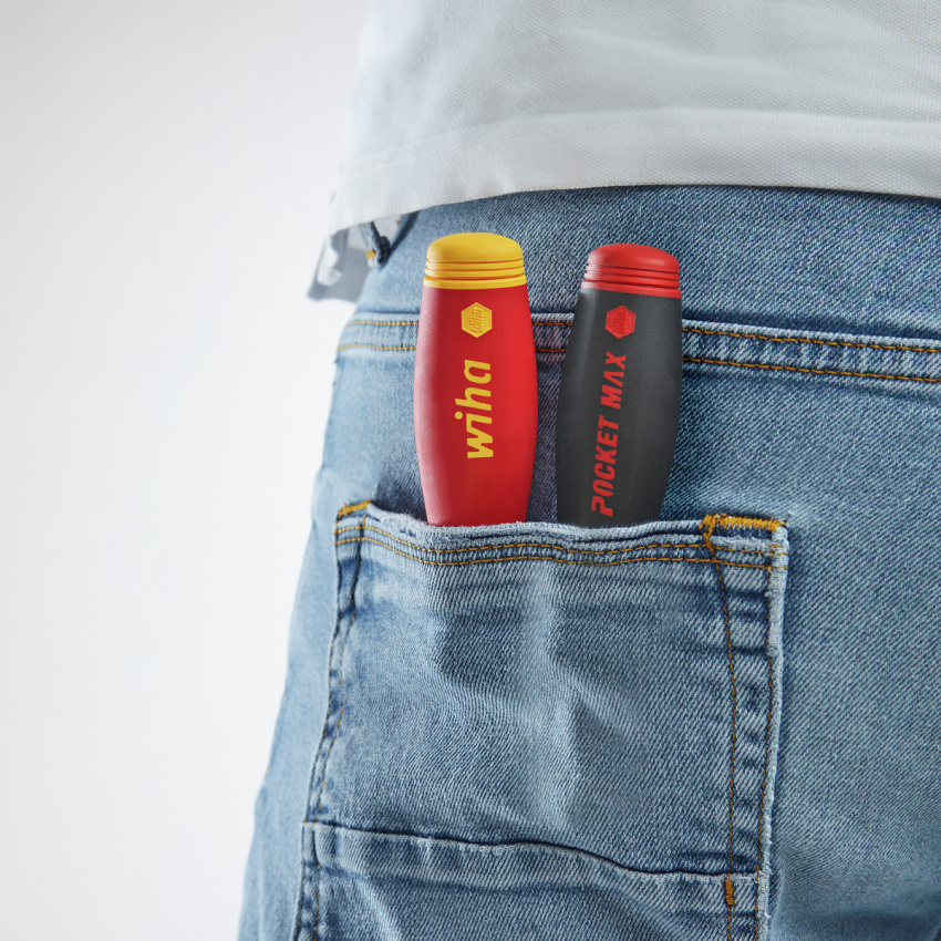 PocketMax® eletric je šroubovák se zásobníkem nástavců od předního výrobce nářadí WIHA. Tento multifunkční nástroj vám nabízí mít nejdůležitější šroubováky vždy po ruce. Vejde se do každé kapsy u kalhot či košile. Pouzdro na bity je bezpečně uschováno v rukojeti. Uvnitř se nachází čtyři nástavce slimBit. Štíhlé, 75 mm dlouhé nástavce slimBit poskytují dokonalý přístup k hluboko uloženým šroubům. Díky funkci magnetického uzamčení lze držák bitů snadno otevřít. Otočná hlavice vám zajistí pohodlnou manipulaci. Tato lehká a kompaktní kapesní souprava PocketMax® nabízí maximální bezpečnost. Držák bitů se zásobníkem i obsažené nástavce slimBit jsou certifikované podle mezinárodní normy IEC 60900-1, tím pádem jsou vhodné pro šroubování v blízkosti dílů pod napětím do 1 000 V AC.