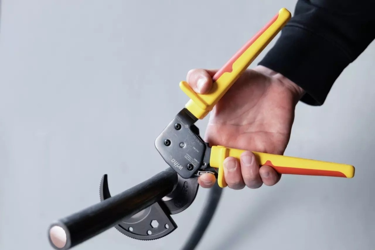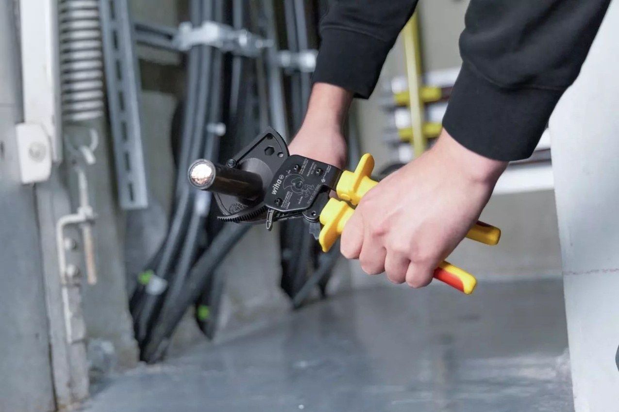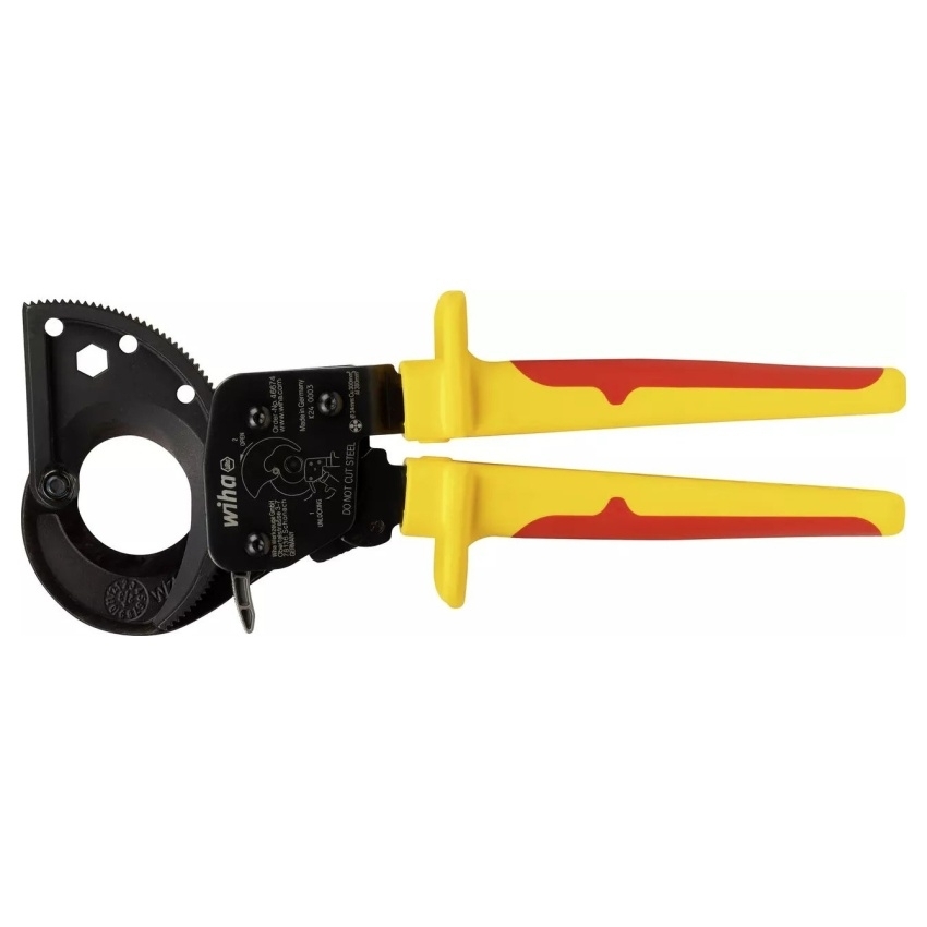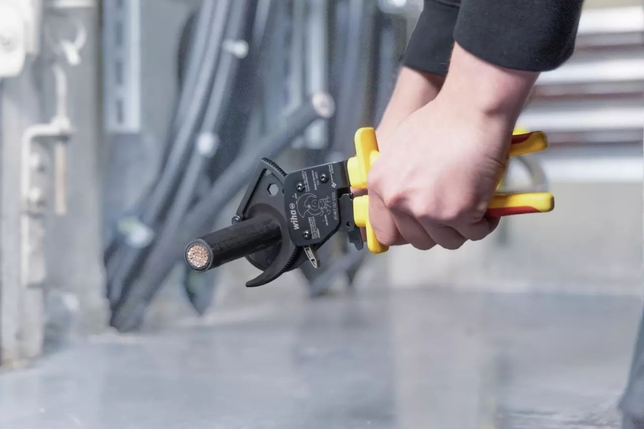 Kleště na kabely Wiha 46674 s ráčnovým principem umožňují snadné a bezpečné stříhání velkých měděných a hliníkových kabelů jednou rukou.