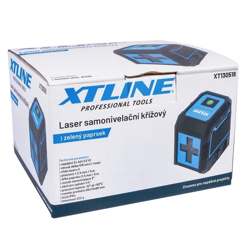 Samonivelační stavební laser XTLINE je měřidlo určené pro použití ve stavebnictví a při montážních pracích. Zařízení umožňuje vytyčení křížové linie a funkce samonivelace zajišťuje přesné a rychlé nastavení paprsku bez nutnosti manuálního vyrovnávání jeho polohy a výšky. Laser pracuje se zeleným paprskem o vlnové délce 515 nm, dosahuje maximálního dosahu 20 m a přesnosti ± 2,5 mm / 5 m. Součástí balení je textilní obal, držák a 2xAA baterie.