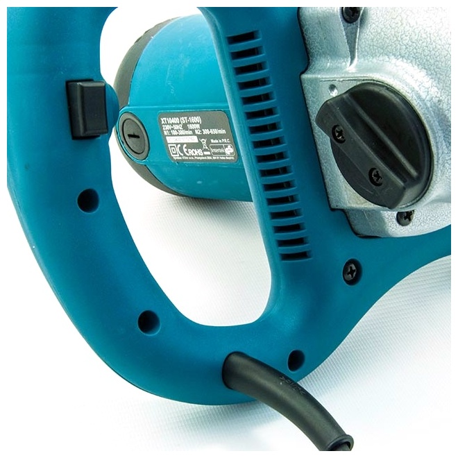 Pohodlná rukojeť pro pevné držení oběma rukama se zabudovaným vypínačem a plynulou regulací otáček která eliminuje "cukání".