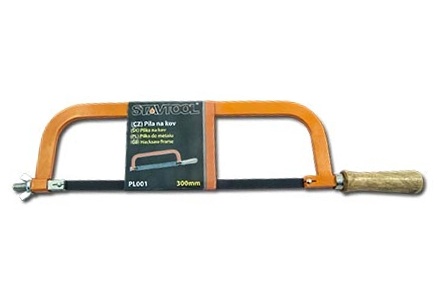 - Rámová pilka na kov s přímou dřevěnou rukojetí.