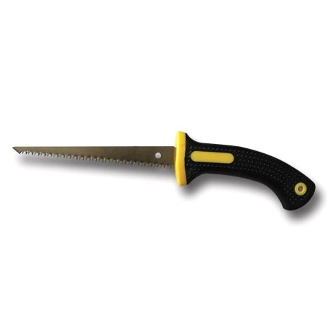 Ruční malá pilka na dokončovací práce se sádrokartonem, dvousložkové držadlo, tenké zúžené ostří, zuby až do špičky.