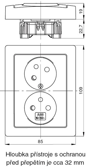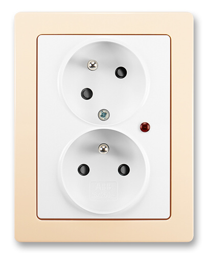 Zásuvka dvojnásobná s ochrannými kolíky, s clonkami, s natočenou dutinou, s ochranou před přepětím. Optická signalizace poruchy. Bezšroubové připojení vodičů (pro vodiče 1,5-2,5 mm2 Cu).